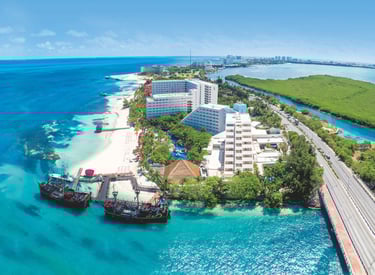 Hotel familiar con playa tranquila, toboganes y shows. Ideal para viajar con niños y disfrutar Cancún.