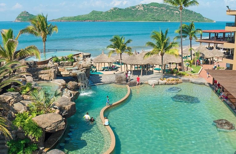 Hotel frente al mar con ambiente familiar, buena ubicación y entretenimiento. Ideal para vacaciones en la playa en Mazatlán.